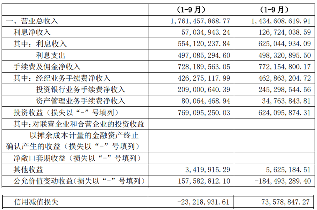 前三季度,财达证券的投资收益为7.69亿元,比去年同期的6.24亿元增长了23.23%;信用减值损失为-2321.89万元,上年同期为7357.88万元。