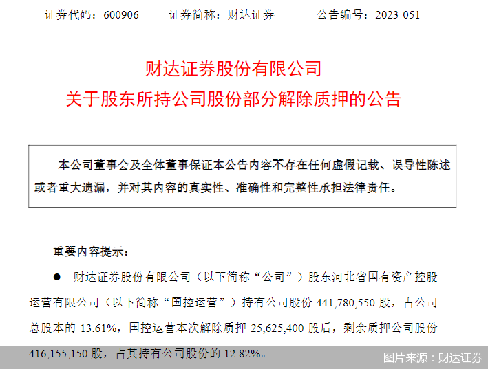 国控运营解除质押后,剩余质押财达证券股份4.16亿股,占其持有财达证券股份的12.82%。