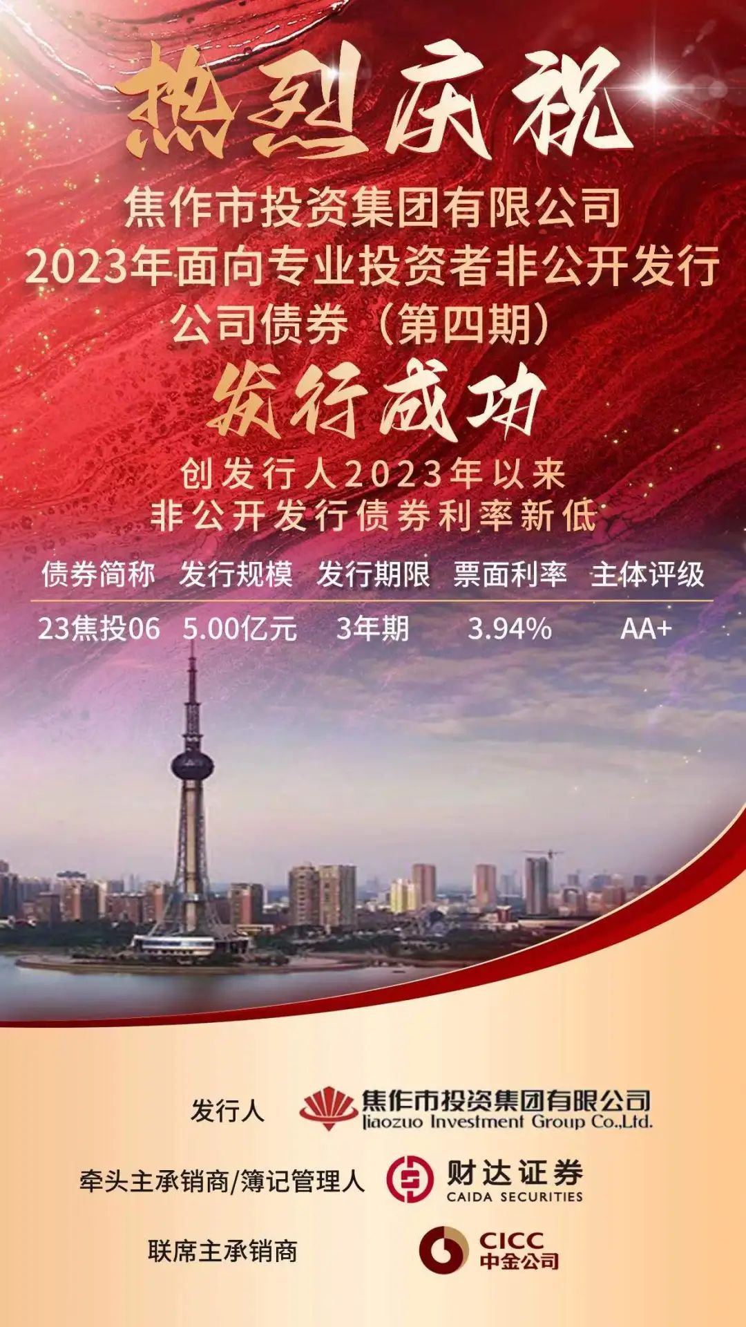 12月14日,焦作市投资集团有限公司2023年面向专业投资者非公开发行公司债券(第四期)(以下简称“本期债券”)成功发行。本期债券发行规模为5亿元,期限3年,票面利率3.94%,创焦作市投资集团有限公司2023年度非公开类债券利率新低。