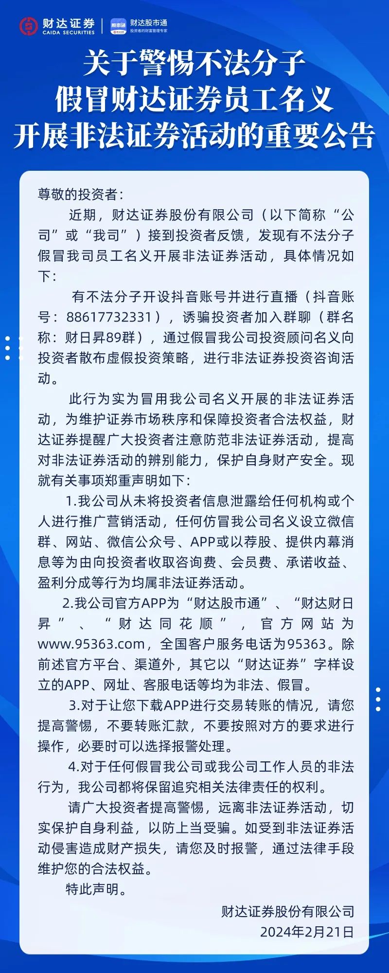 关于警惕不法分子假冒财达证券员工名义开展非法证券活动的重要公告