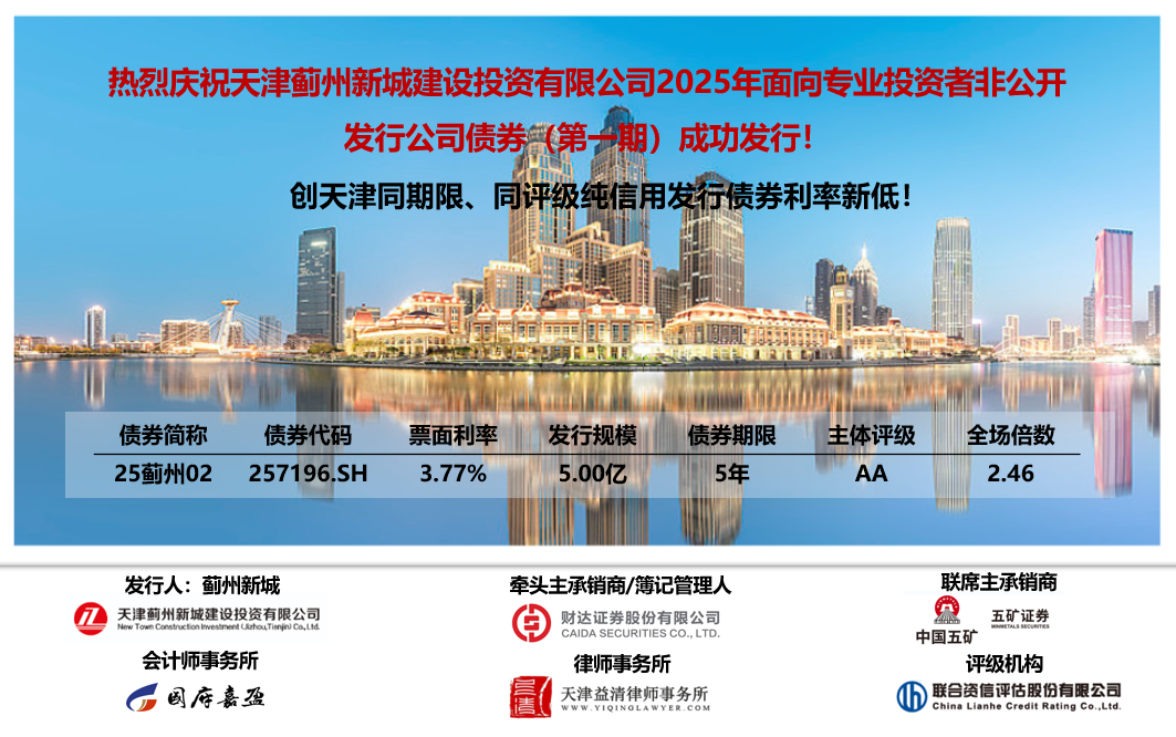 1月10日,天津蓟州新城建设投资有限公司(简称“蓟州新城”)在上海证券交易所成功完成2025年面向专业投资者非公开发行公司债券(第一期)的发行工作。本期债券由财达证券担任牵头主承销商,发行规模为5亿元,发行期限为5年,票面利率为3.77%。本期债券是蓟州新城在公开市场的首支纯5年期产品,票面利率创下蓟州新城债券发行利率历史新低,同时也是近些年天津市首个AA主体评级发行人5年期产品纯信用发行的最低利率,进一步提升了蓟州新城的市场信誉及融资能力。