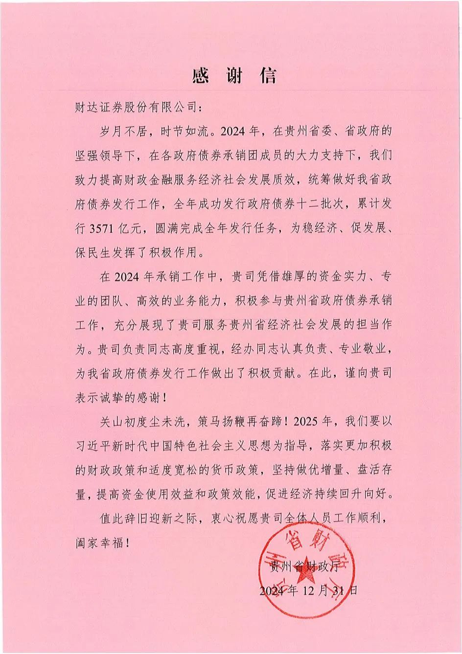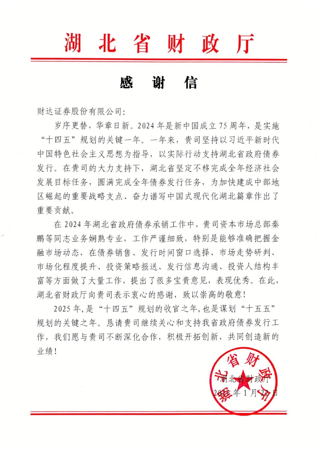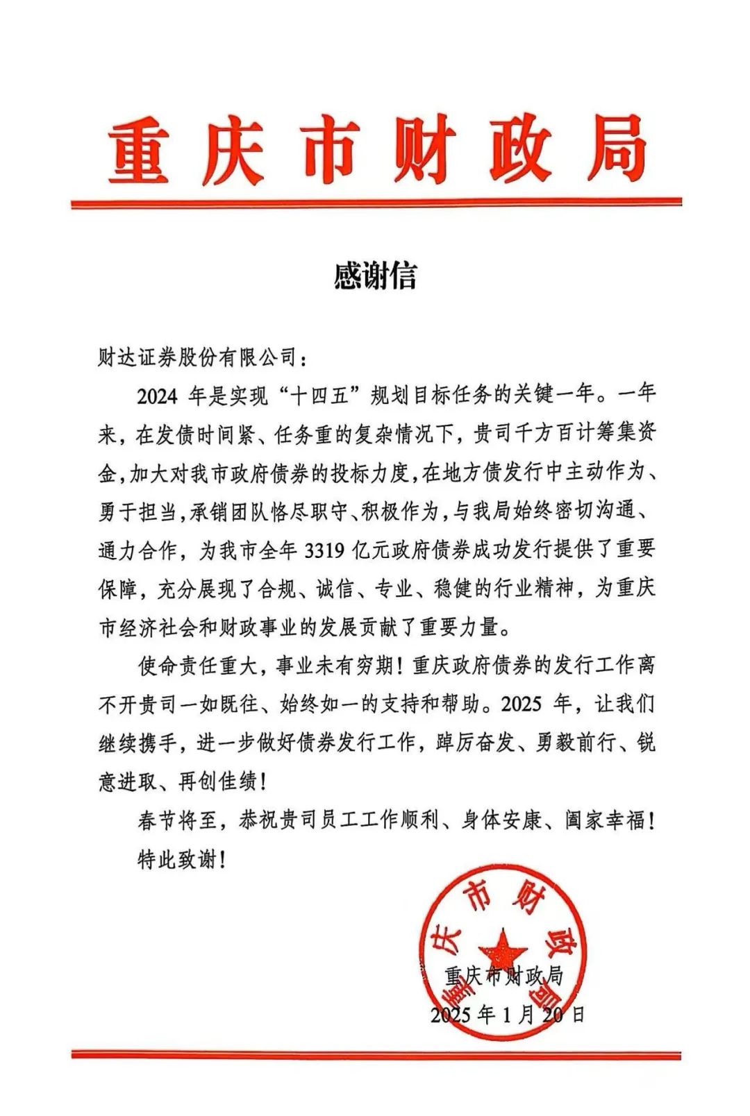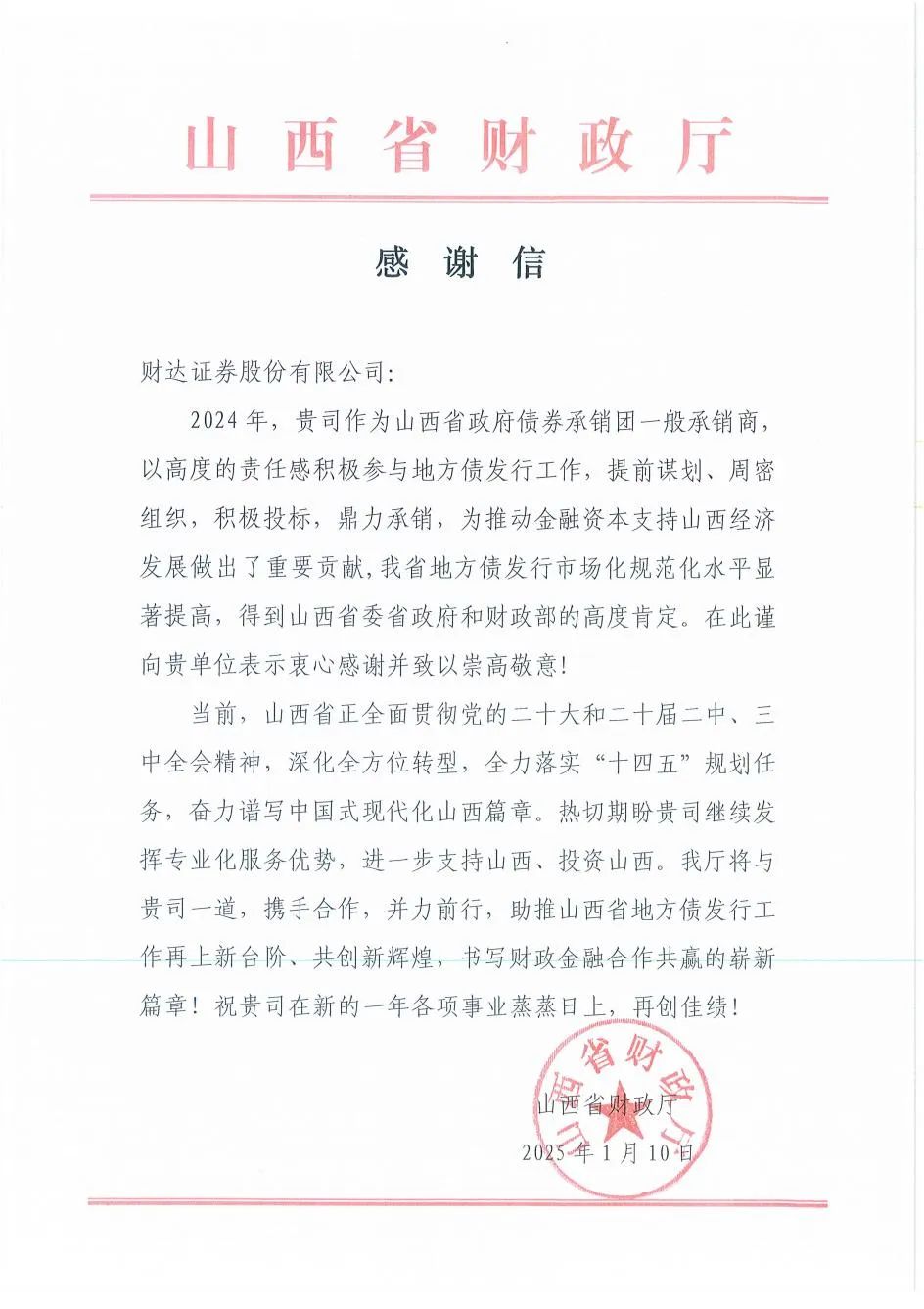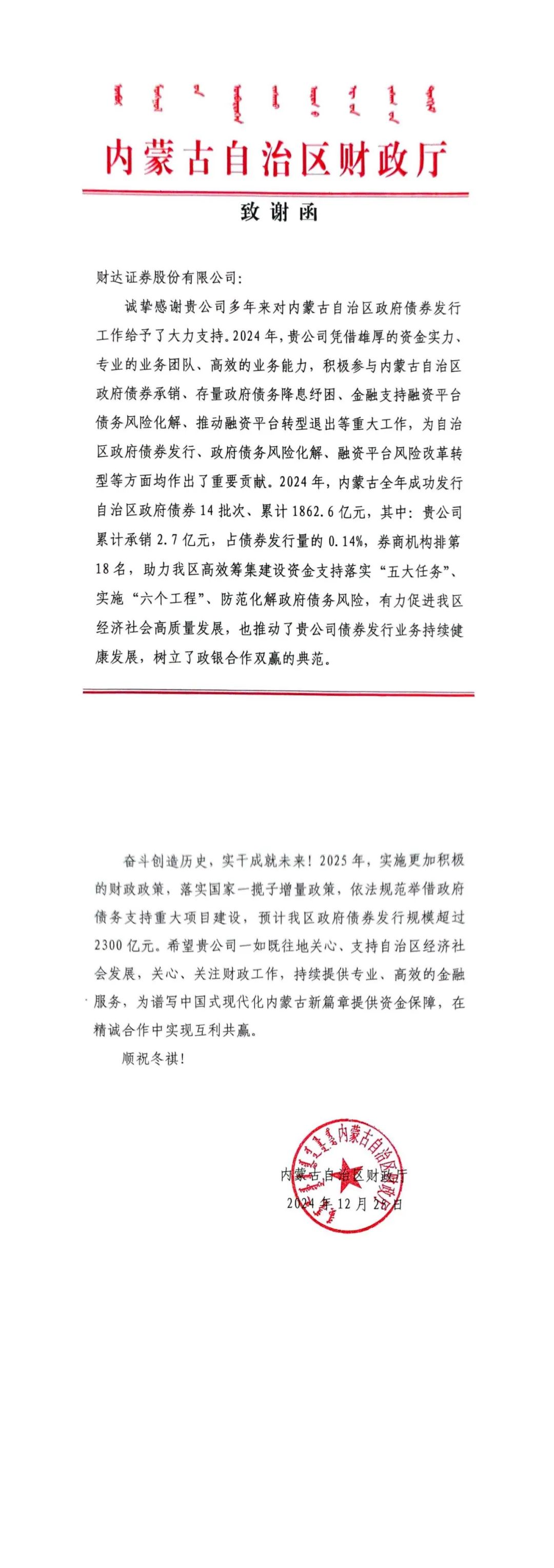 行胜于言,事成于实。2025年春节前夕,公司陆续收到贵州省、山西省、湖北省、内蒙古自治区、重庆市等多地财政厅(局)感谢信,对公司2024年在各地区地方政府债券发行工作中的专业素养和业务能力给予肯定,对公司服务地区经济社会高质量发展发挥的积极作用表示认可。