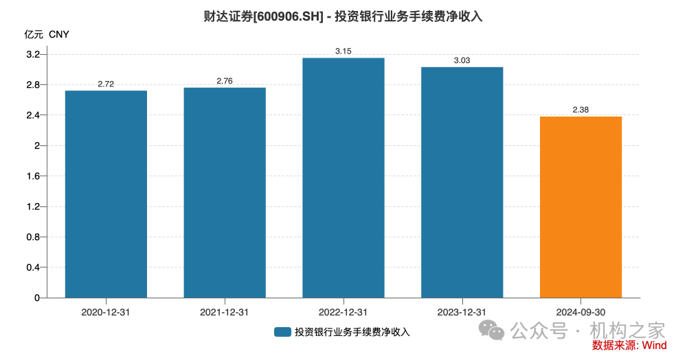 证券经纪业务作为财达证券重要的收入支柱,一直以来在公司业务体系中占据着举足轻重的地位。然而,近年来这一业务面临着不小的挑战。由于市场行情震荡,投资者的风险偏好下降,市场交投活跃度降低。与此同时,尽管财达证券凭借在河北省内广泛且深入的网点布局,在当地股票交易市场份额方面保持着领先地位,但随着券商间竞争愈发激烈,佣金率持续下滑,财达证券的经纪业务收入受到了一定的冲击。该业务手续费净收入自2021年创下7.54亿元的阶段高点之后,2022年、2023年接连下滑至5.98亿元、5.58亿元,同比分别下跌20.72%、6.60%。2024年前三季度则同比小幅下滑3.63%至4.11亿元,跌幅有所收敛。由于2024年第四季度A股市场交投活跃,预计2024年经纪业务整体会有所回暖。