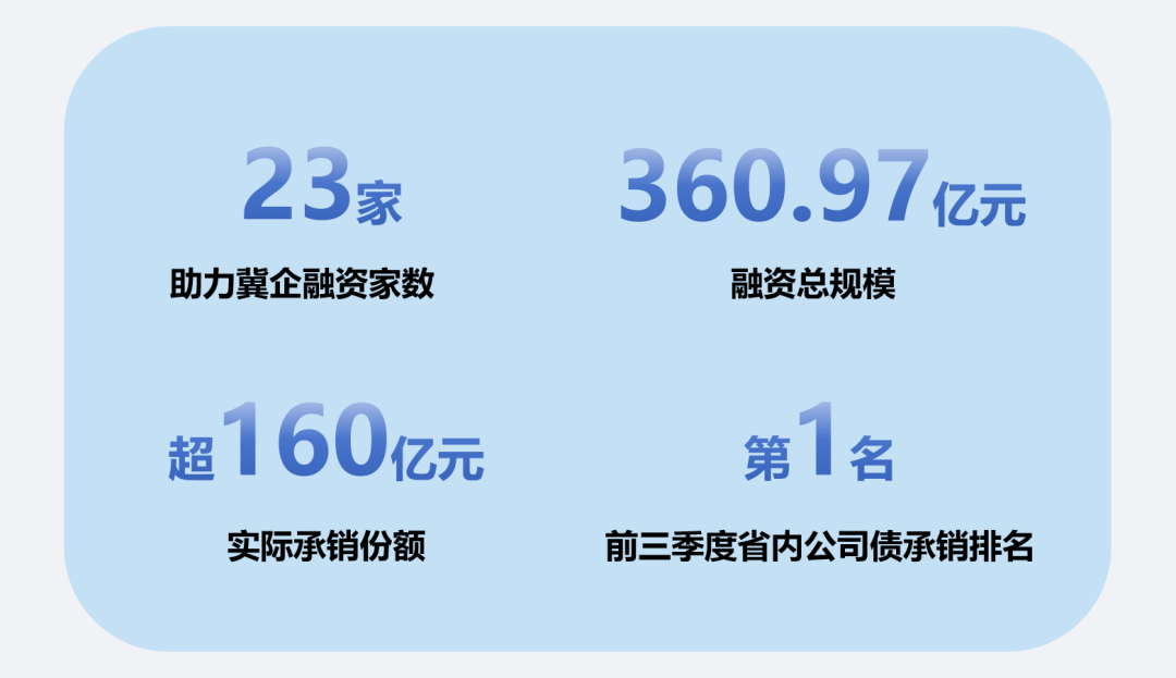 2025年前三季度,财达证券深耕河北,凭借专业金融服务为省内经济高质量发展注入强劲动能。公司成功助力23家省内市场主体完成融资,覆盖公司债券、资产支持证券(ABS)及商业银行资本补充债券等多元产品,累计实现融资总额360.97亿元,其中,财达证券实际承销份额超160亿元。前三季度,财达证券继续保持河北省内公司债券承销排名第一名。