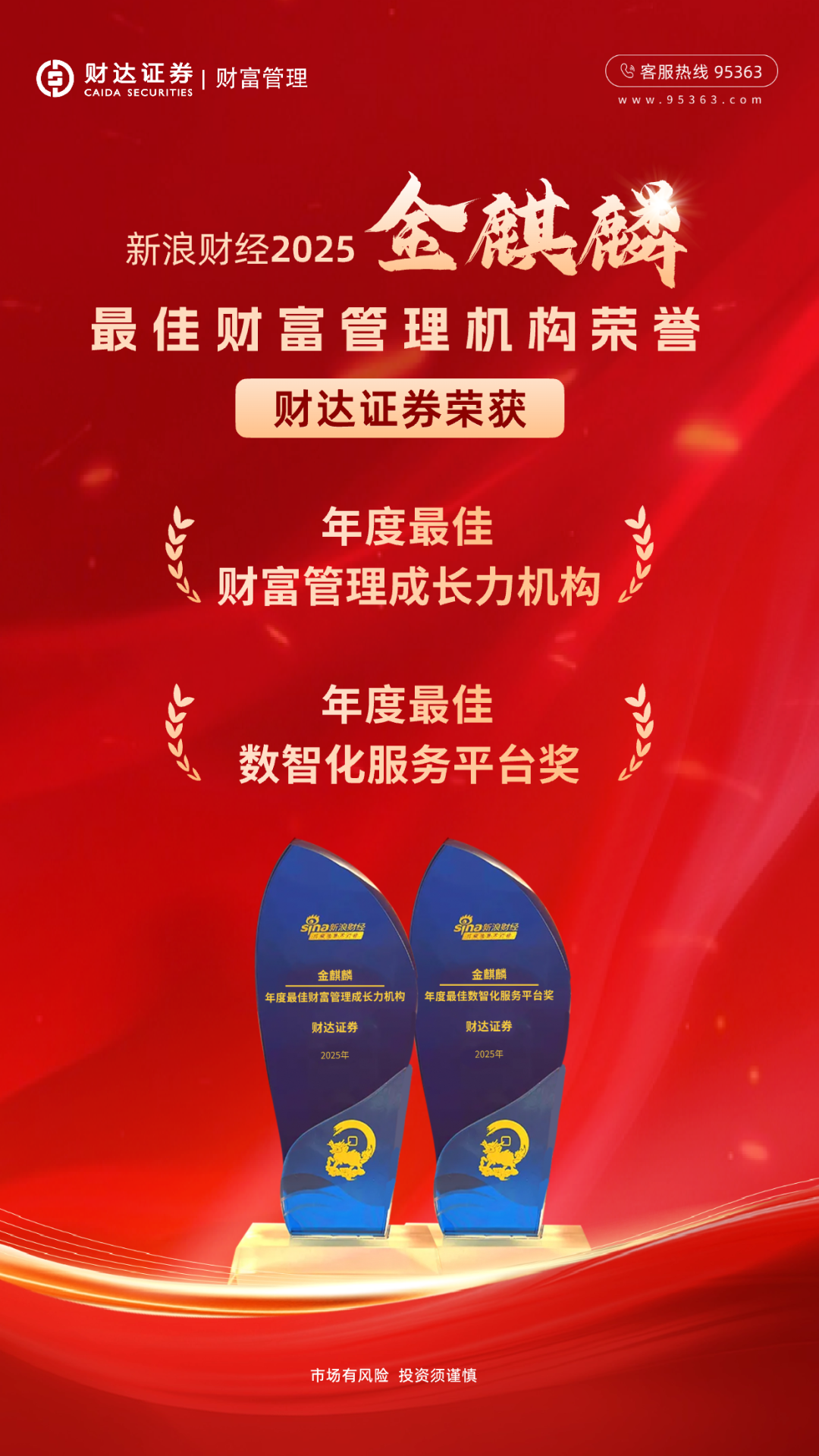 1月15日,新浪财经在北京举办的“2026全球与中国资本市场展望论坛暨金麒麟最佳财富管理机构、最佳投资顾问盛典”上,揭晓金麒麟最佳财富管理机构评选结果。财达证券凭借在财富管理领域的卓越表现,荣获“年度最佳财富管理成长力机构” 和“年度最佳数智化服务平台奖”两项大奖,彰显公司在财富管理转型中的专业实力与行业影响力。