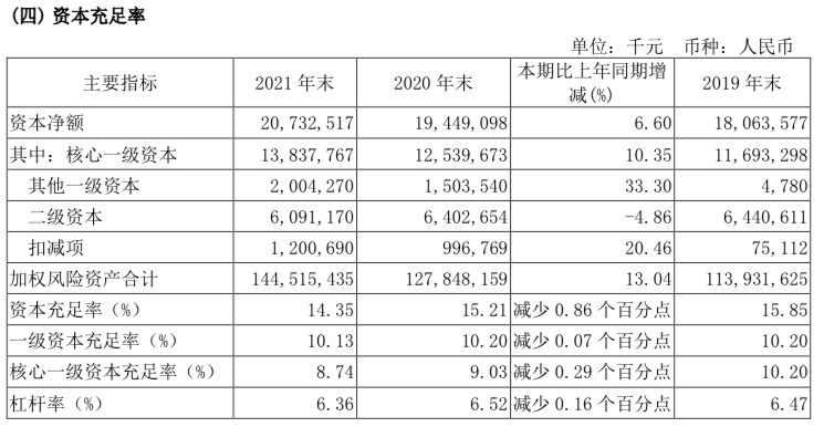 具体来看,资本充足率为14.35%,比上年下降0.86个百分点;一级资本充足率为10.13%,比上年下降0.07个百分点;核心一级资本充足率为8.74%,比上年下降0.29个百分点。