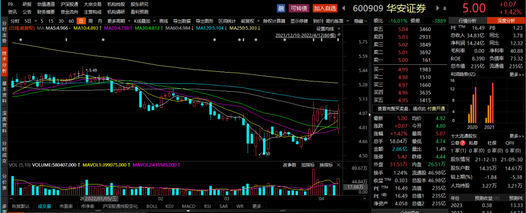 4月12日,受股东计划减持股份消息,以及大盘低迷情绪影响,华安证券早盘低开自走,跌幅一度达4.74%,好在午后伴随着大盘的拉涨,华安证券由绿翻红,最后收涨1.42%报5元/股。