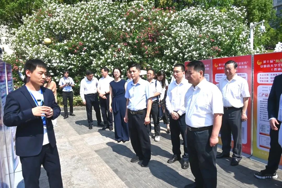 闭幕式开始前,参加仪式人员集体参加第十届“挑战杯”安徽省大学生创业计划竞赛终审决赛作品巡展,并与部分优秀作品团队学生代表交流。