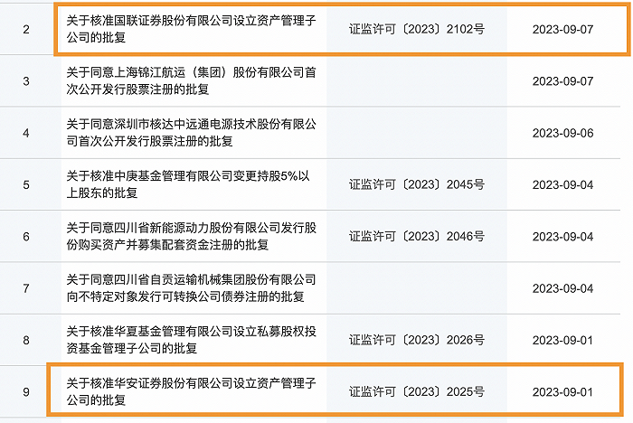 9月8日,国联证券(601456.SH)、华安证券(600909.SH)披露称,收到了来自证监会的核准批复。证监会核准批复了上述两家券商的资管子公司设立申请。据悉,国联资管、华安资管注册金分别为10亿元、6亿元。