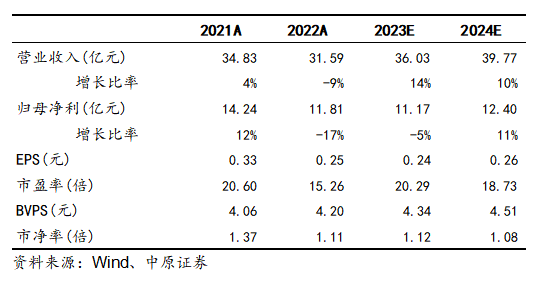 预计公司2023、2024年EPS分别为0.24元、0.26元,BVPS分别为4.34元、4.51元,按9月7日收盘价4.87元计算,对应P/B分别为1.12倍、1.08倍,维持“增持”的投资评级。