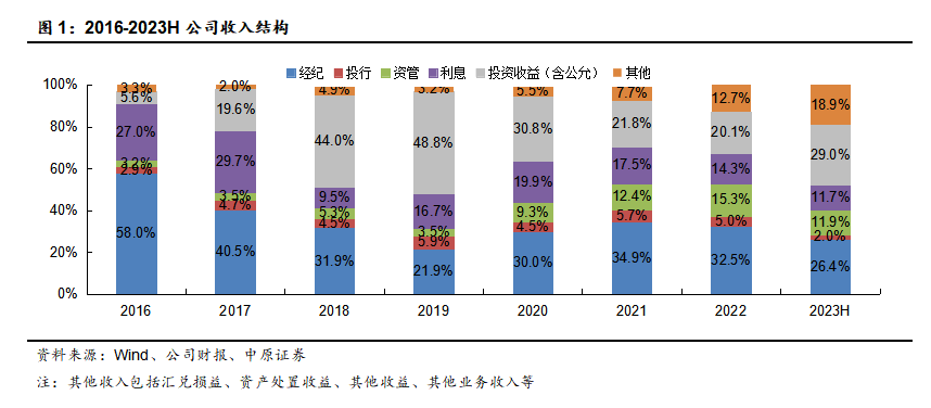 2023H公司经纪、投行、资管、利息、投资收益(含公允价值变动)和其他业务净收入占比分别为26.4%、2.0%、11.9%、11.7%、29.0%、18.9%,2022年分别为32.5%、5.0%、15.3%、14.3%、20.1%、12.7%。