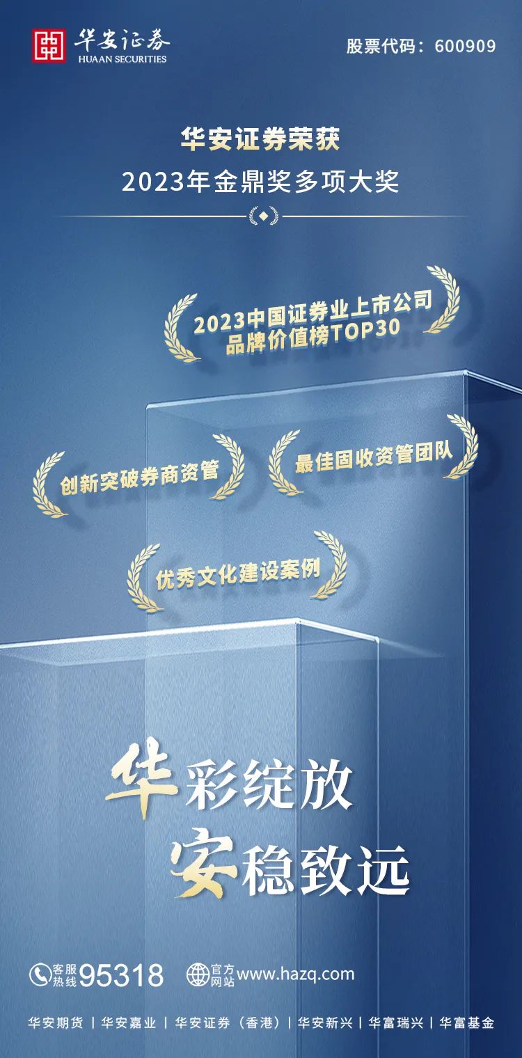 11月3日,金鼎奖新鲜出炉,华安证券连续三年问鼎中国上市证券公司品牌价值top30,斩获“创新突破券商资管”“最佳固收资管团队”及“优秀文化建设案例”金鼎奖。