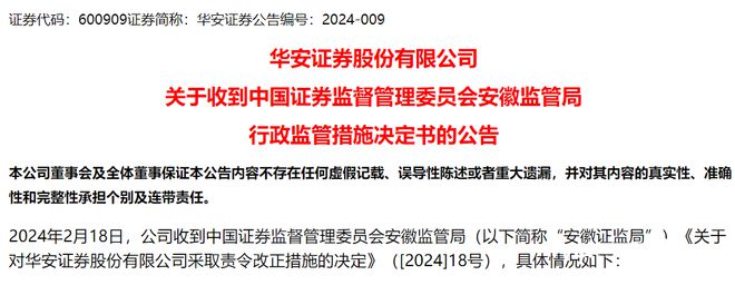 2月18日晚间,华安证券(600909.SH)公告,公司收到安徽证监局《关于对华安证券股份有限公司釆取责令改正措施的决定》(下称《决定》),事由涉及研报制作、人员管理、网络安全管理、“两融”业务管理以及投行业务等。