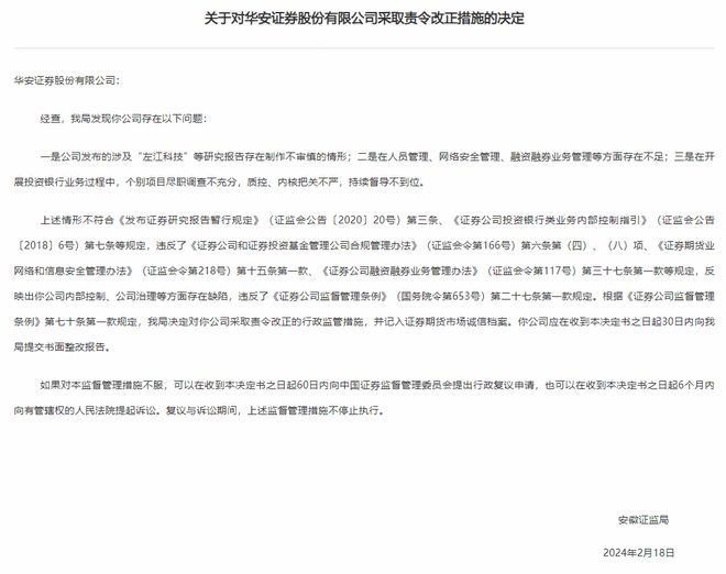 2月18日,安徽证监局公布了对华安证券采取责令改正措施的决定。