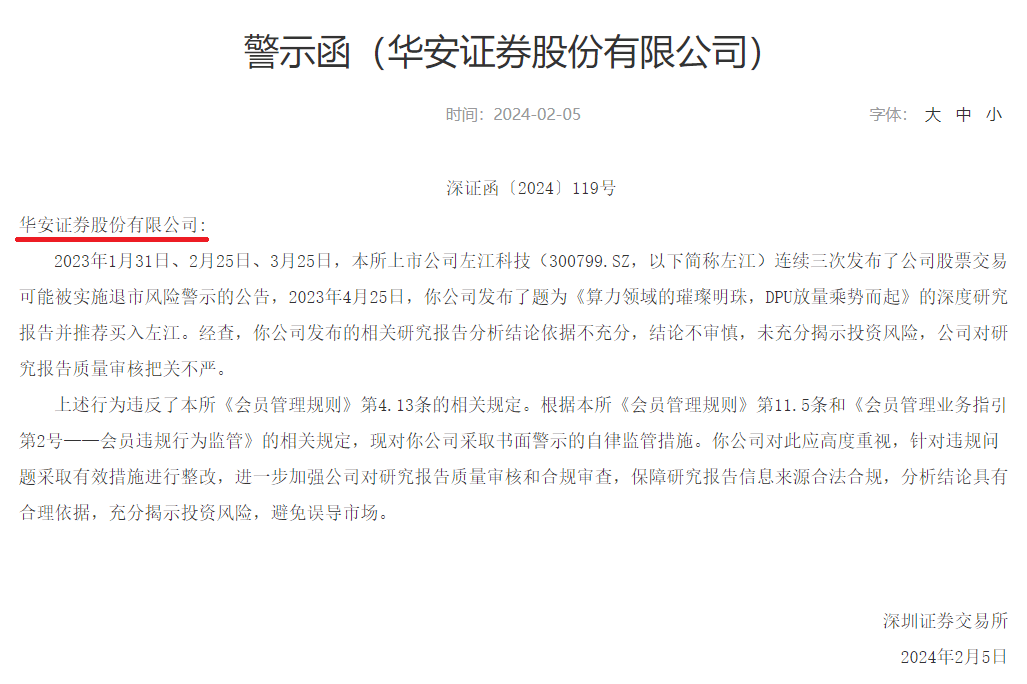 有关“左江科技”研报制作不谨慎问题,已不是华安证券第一次受罚,深交所在2024年2月5日已经给该券商出具了警示函。