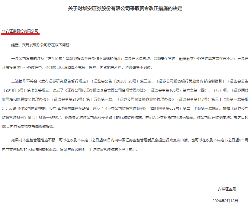 2月18日晚,华安证券发布公告称,公司收到安徽证监局《关于对华安证券釆取责令改正措施的决定》,“经查,我局发现你公司存在以下问题:一是公司发布的涉及‘左江科技’(即*ST左江)等研究报告存在制作不审慎的情形;二是在人员管理、网络安全管理、融资融券业务管理等方面存在不足;三是在开展投资银行业务过程中,个别项目尽职调查不充分,质控、内核把关不严,持续督导不到位。”