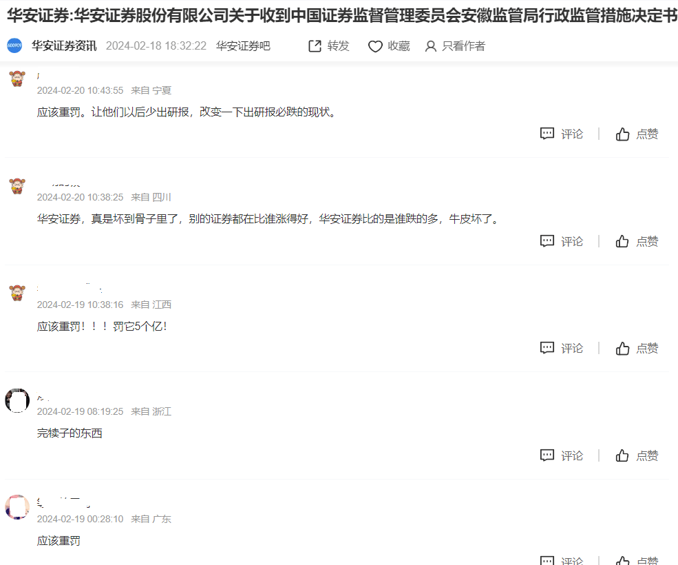 “应该重罚。让他们以后少出研报,改变一下出研报必跌的现状。”2月20日,有投资者在华安证券股吧里抱怨,多数投资者均表示,应该重罚华安证券。
