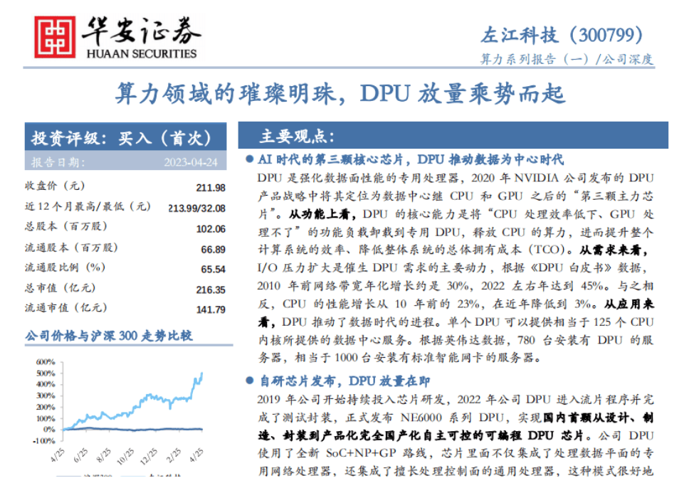 究其原因,即2023年1月31日、2月25日、3月25日,*ST左江连续三次发布公司股票交易可能被实施退市风险警示的公告。但在2023年4月25日,华安证券突然发布了题为《算力领域的璀璨明珠,DPU放量乘势而起》的“左江科技”深度研究报告。