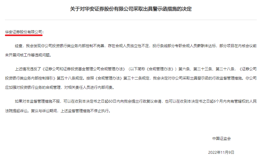 值得注意的是,华安证券在2022年11月也曾被中国证监会“采取出具警示函措施的决定”,原因就是该券商“投资银行类业务内部控制不完善,存在合规人员独立性不足,投行条线部分专职合规人员薪酬未达标,部分项目在内核会议前未开展问核工作等违规问题”,上述情况违反了相关规定,因此决定对华安证券采取出具警示函的行政监督管理措施。“你公司应加强对投资银行业务的合规管理,对相关责任人员进行内部问责。”