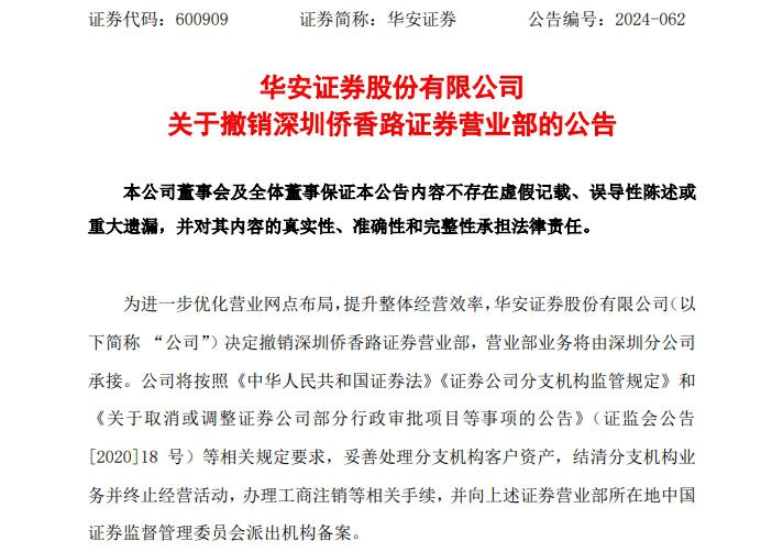 华安证券(600909)12月3日晚间公告称,公司决定撤销深圳侨香路证券营业部,以进一步优化营业网点布局和提升整体经营效率,撤销后的业务将由深圳分公司承接。