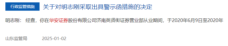 2025年刚开年,华安证券及相关人员便接连收到监管函。1月2日,山东证监局在其官网披露了《对明志刚采取出具警示函措施的决定》。