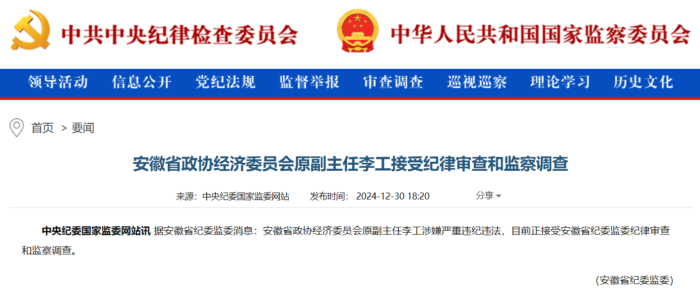 2024年12月30日,安徽省纪委监委发布消息,安徽省政协经济委员会原副主任李工,因涉嫌严重违纪违法,正接受安徽省纪委监委的纪律审查和监察调查。