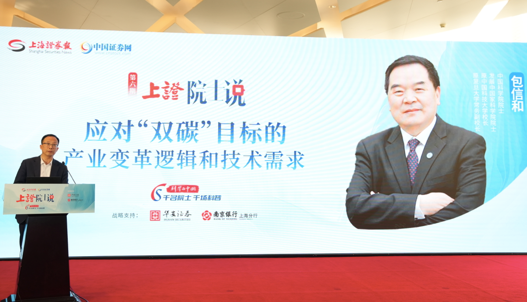 2月19日,第六期“上证·院士说”活动在上海举行。中国科学院院士、著名物理化学家包信和发表题为《应对“双碳”目标的产业变革逻辑和技术需求》的主旨演讲。本次活动由上海证券报社主办,华安证券、南京银行上海分行战略支持。