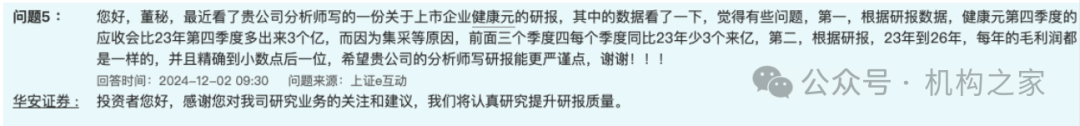2024年底,有投资者在交易所互动平台询问华安证券董秘,对华安证券分析师关于上市企业健康元的研报数据表示怀疑,如“根据研报数据,健康元第四季度的应收会比23年第四季度多出来3个亿,而因为集采等原因,前面三个季度四每个季度同比23年少3个来亿”,“第二,根据研报,23年到26年,每年的毛利润都是一样的,并且精确到小数点后一位”。华安证券回应称,感谢关注和建议,将认真研究提升研报质量。