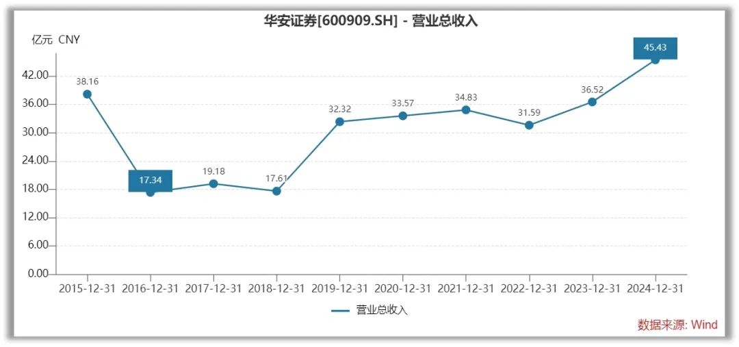 数据显示,2022年-2024年,华安证券的营业收入分别为31.59亿元、36.52亿元、45.43亿元。2023年及2024年分别同比增长15.6%、24.4%。