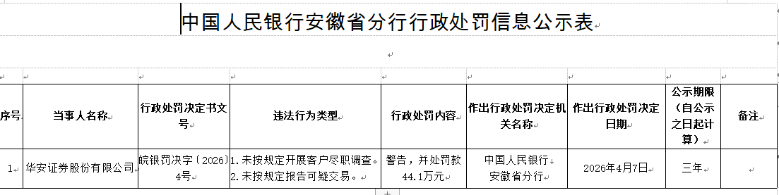 央行网站近日披露的中国人民银行安徽省分行行政处罚信息公示表(皖银罚决字〔2026〕4号)显示,华安证券股份有限公司存在以下违法行为:1.未按规定开展客户尽职调查。2.未按规定报告可疑交易。