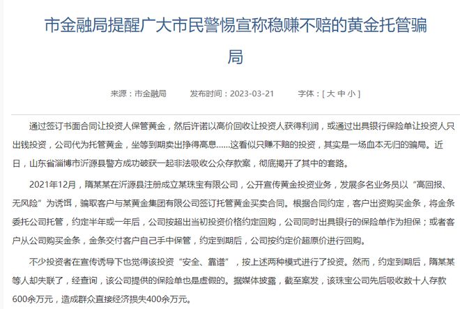 这种行为本身就有法律风险,也有不少投资者吃过亏。2023年3月,南通市人民政府官网就发布了“市金融局提醒广大市民警惕宣传稳赚不赔的黄金托管骗局”的公告,披露了一起黄金托管骗局。