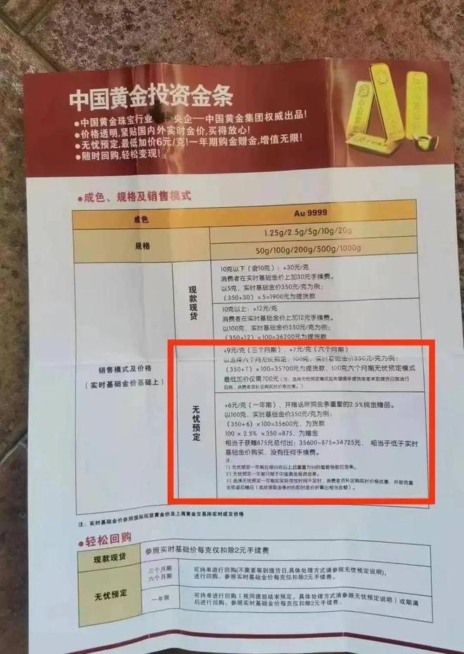 另外,购买人可随时持单进行回购(但没有了相应优惠),或1年期满后要求中国黄金进行回购,但需参照实时基础金价每克仅扣除2元手续费。期限上,也可以选择3个月或6个月,但优惠条件不同。