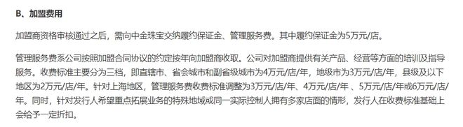 中国黄金招股书显示,加盟费用包括履约保证金5万元/店;管理服务费收费标准主要分为3档,即直辖市、省会城市和副省级城市为4万元/店/年,地级市为3万元/店/年,县级及以下地区为2万元/店/年。