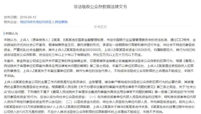 值得注意的是,北京紫金珠宝有限公司还曾涉及一起非法吸收公众存款案。据2018年9月13日克拉玛依市克拉玛依区人民检察院公布的一则法律文书显示。Z某某、B某某违反国家金融管理制度,未经中国银行业监督管理委员会的依法批准,通过口口相传、主动游说的方式向社会公开宣传,假借销售珠宝玉石,委托保管的形式,承诺在一定期限给付高额利息并还付本金,向社会不特定对象吸收资金,严重扰乱社会金融秩序,其中上诉人Z某某吸收资金2852000元,上诉人B某某吸收资金1352000元,均属数额巨大,其行为均已构成非法吸收公众存款罪,依法应处三年以上十年以下有期徒刑,并处五万元以上五十万元以下罚金。