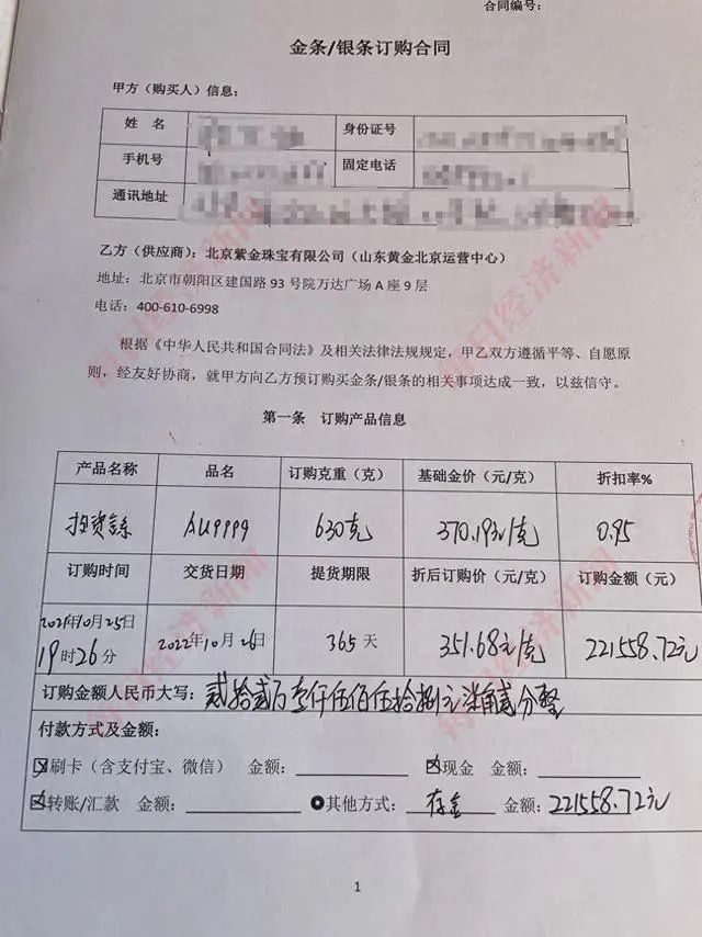 朱女士提供的金条订购合同显示,2021年10月25日,她在北京紫金珠宝有限公司(山东黄金北京运营中心)购入630克AU9999,购入时基础金价370.19元/克,九五折后价格为351.68元/克,总投资金额221558.72元,约定提货期限为365天。