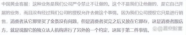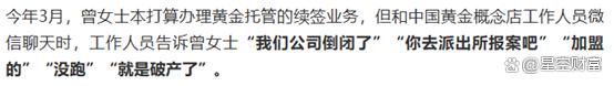 只是,根据中国黄金客服回复来看,倒闭的门店是加盟店,且黄金托管业务是门店自行开展的。简单来说就是,这是消费者跟三方门店之间的约定,跟中国黄金没有关系。