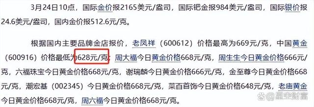 3月24日,国内金价报512.6元/克。而根据国内主要品牌金店报价,老凤祥价格最高,为669元/克;中国黄金价格最低,为628元/克。