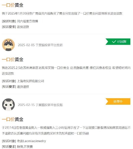 另外,据消费保”提供的数据显示,平台2024年累计收到7000多件黄金珠宝的投诉案件,其中黄金类产品投诉占到八成,而“一口价”黄金的相关投诉占黄金类投诉量的62%。