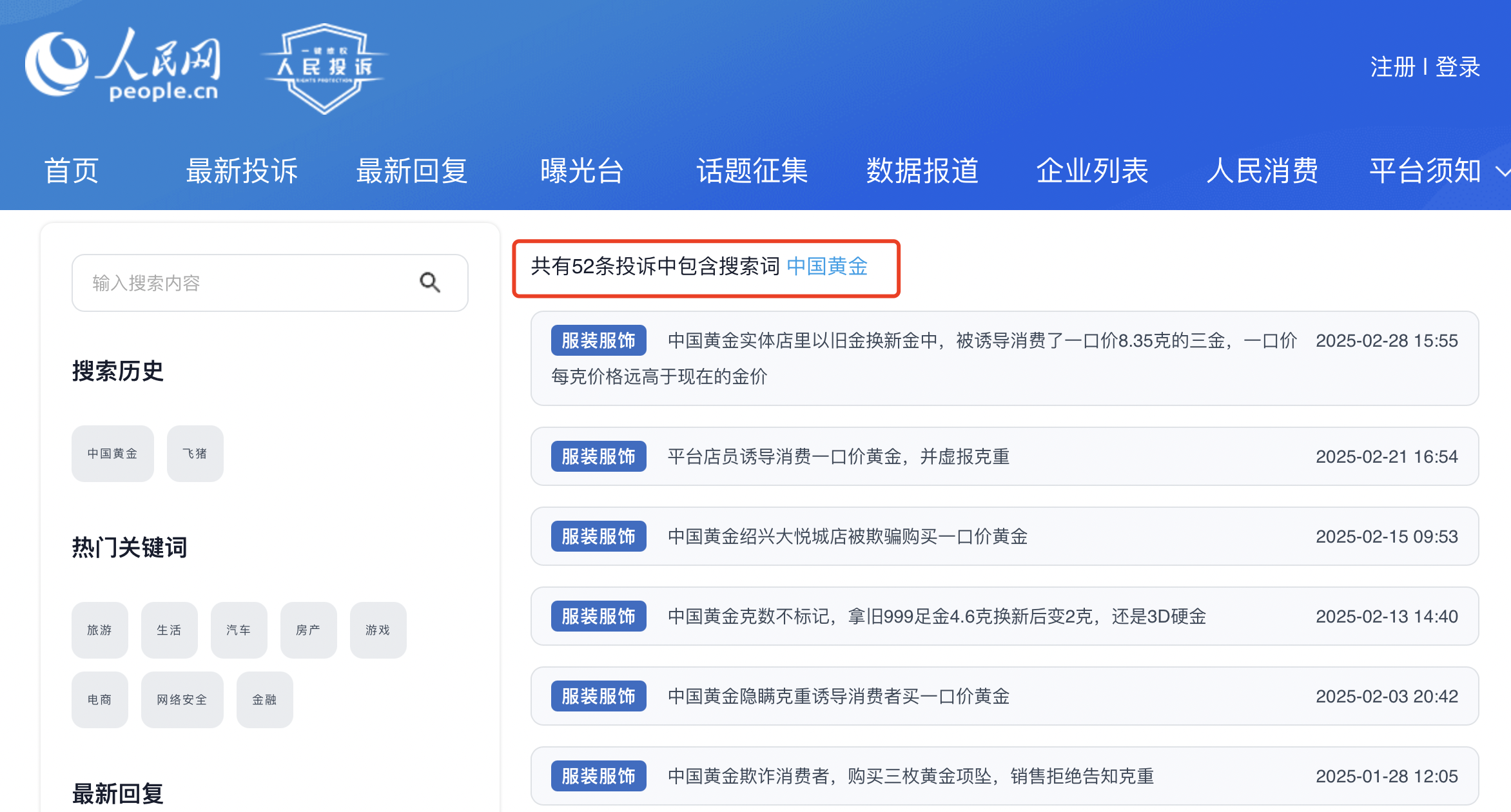 在人民网投诉平台上搜索发现,共有52条投诉中包含搜索词“中国黄金”,投诉的内容涉及诱导消费、未告知克重等问题。
