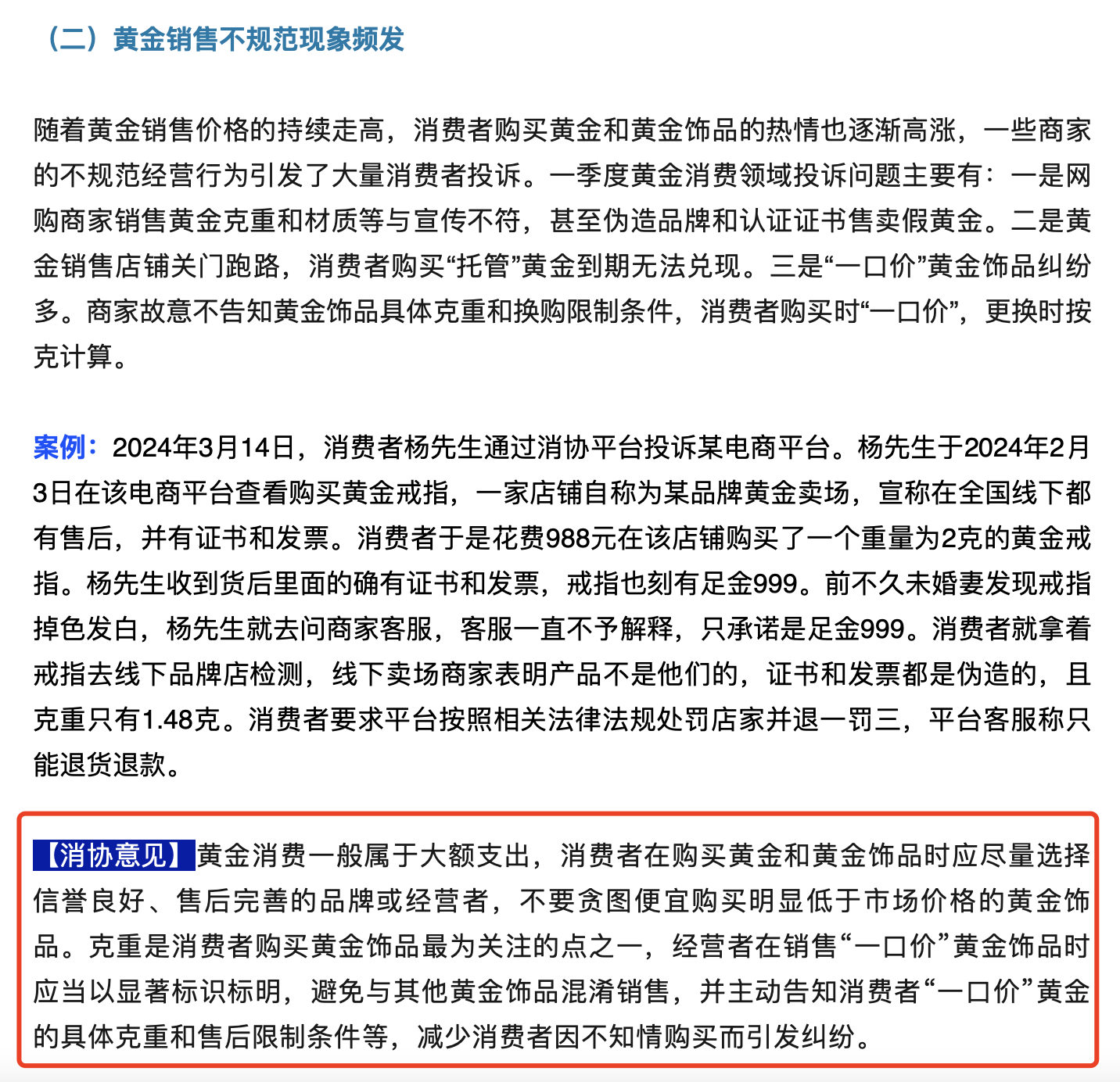 中国消费者协会曾指出,克重是消费者购买黄金饰品最为关注的点之一,经营者在销售“一口价”黄金饰品时应当以显著标识标明,避免与其他黄金饰品混淆销售,并主动告知消费者“一口价”黄金的具体克重和售后限制条件等,减少消费者因不知情购买而引发纠纷。