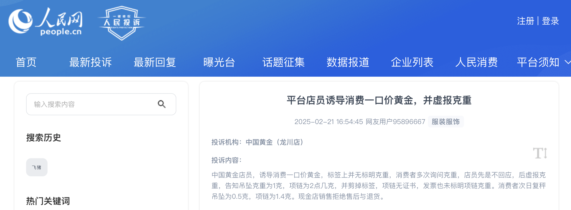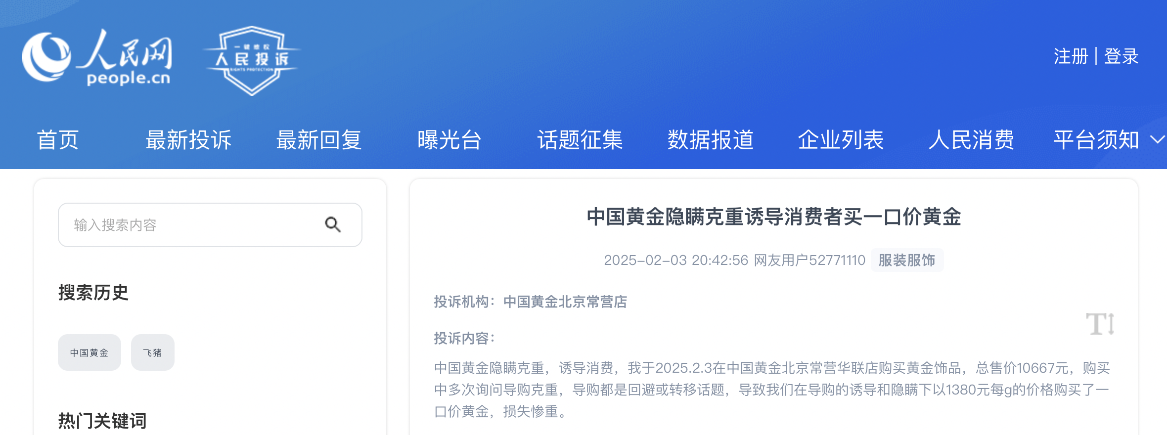 还有消费者称,其于2025年2月3日在中国黄金店里购买黄金饰品,总售价10667元,购买中曾多次询问销售克重,但销售都是回避或转移话题,导致其以1380元每克的价格购买了一口价黄金。