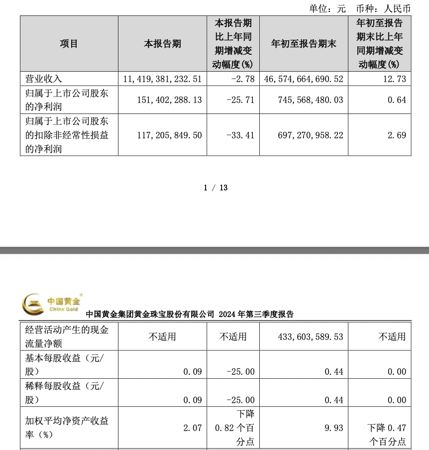 2024年前三季度,中国黄金实现营收为465.75亿元,同比增长12.73%;归母净利润为7.46亿元,同比增长0.64%。