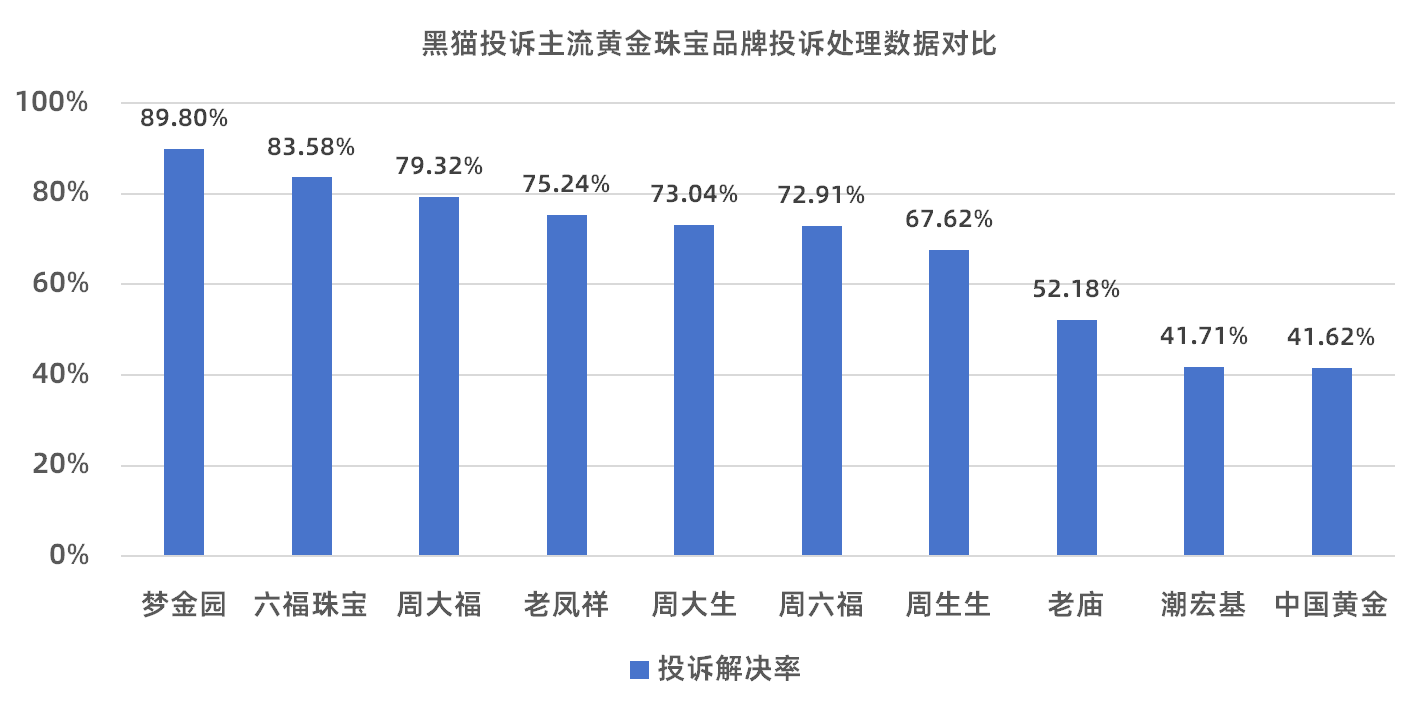 黑猫大数据中心综合品牌知名度和在黑猫投诉平台的投诉处理情况,选取10个黄金珠宝品牌进行对比分析。对比维度是2024年度的投诉解决率,涉及的品牌包括梦金园、六福珠宝、周大福、老凤祥、周大生、周六福、周生生、老庙、潮宏基和中国黄金。