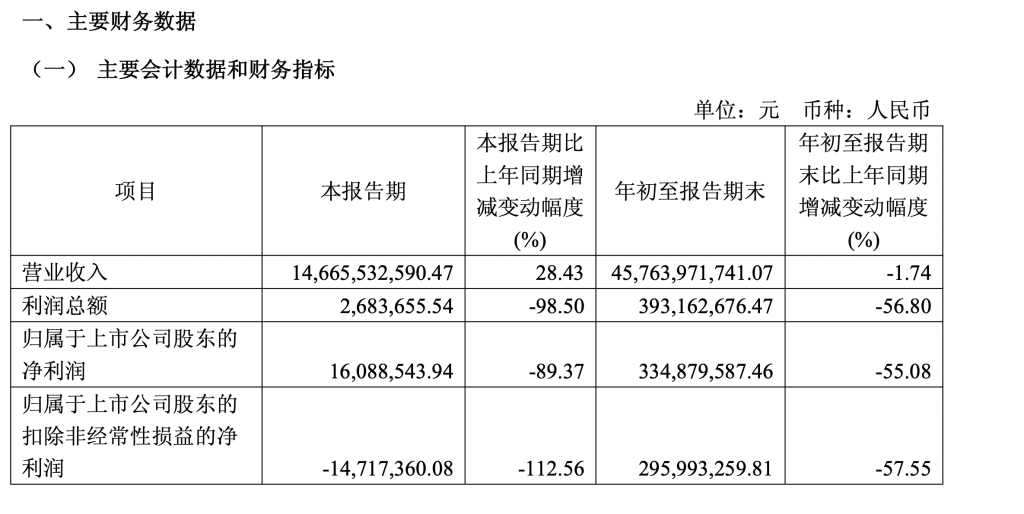 中国黄金前三季度营业收入457.64亿元,同比下降1.74%;归属于上市公司股东的净利润3.35亿元,同比下降55.08%。年初至报告期末净利润同比减少,主要因为经营性应收项目及存货较年初增加导致经营活动产生的现金流量净额减少。