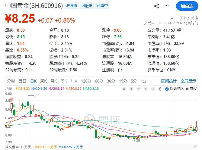 中国黄金的股价也没有进一步创出新低,2025年7.56元的最低价还要略高于2024年的最低价,股价运行重心反而有所抬升。