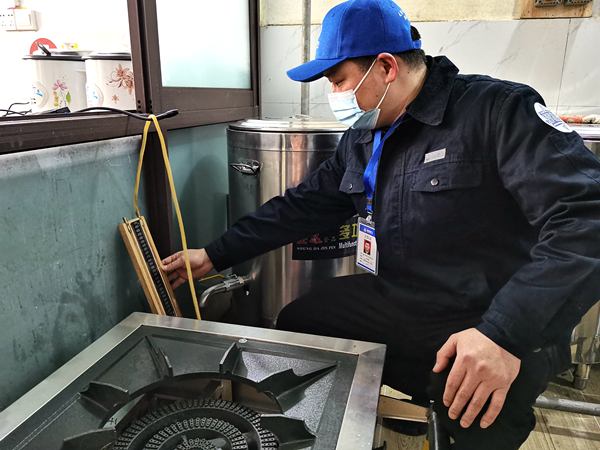“晚上关店的时候要检查灶具开关和气阀,别忘了关就走哦,还有用气的时候注意通风。气表的电池这样装,我给你示范哈……”燃气工作人员再三叮嘱余红霞,并告知她安全用气常识。
