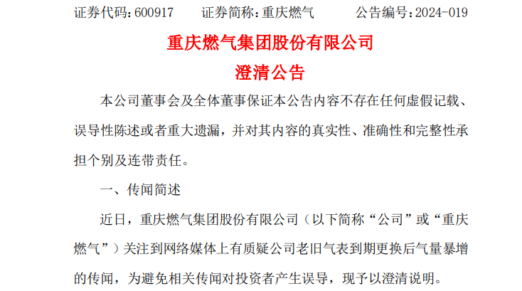 为避免相关传闻对投资者产生误导,4月12日晚间,重庆燃气(600917)曾发布公告澄清称,公司系根据国家相关安全及计量检定规程对服役到期的气表进行更换。