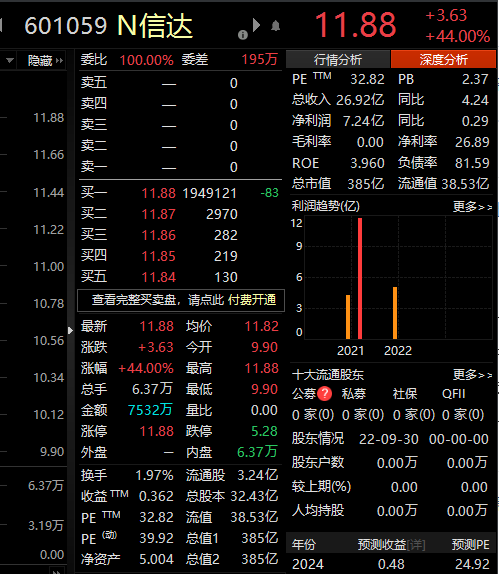 兔年首只券商股信达证券今日上市!该股顶格高开涨20%,报9.9元,连续竞价阶段涨幅扩大至44%,达到上市首涨幅限制,报11.88元,总市值385亿元。