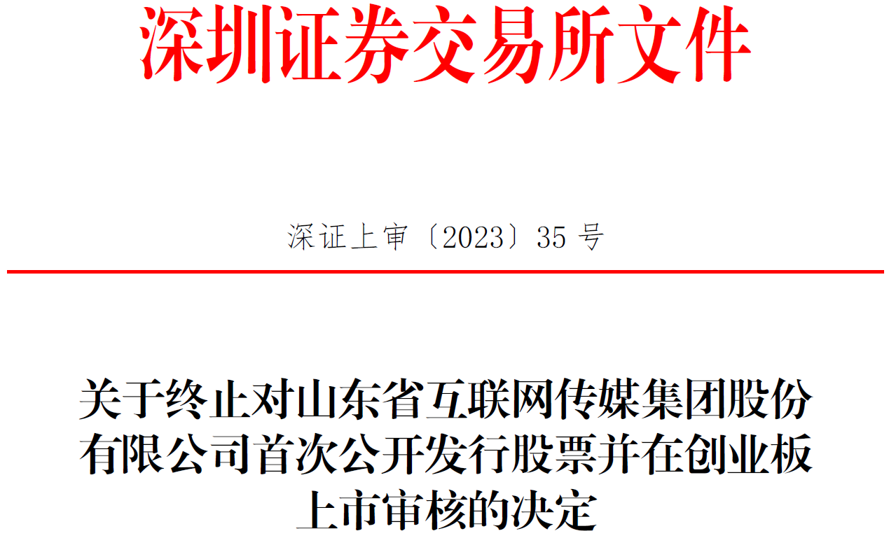 2023年2月7日,互联传媒向深交所提交了《山东省互联网传媒集团股份有限公司关于撤回首次公开发行股票并在创业板上市申请文件的申请》,保荐人向深交所提交了《中泰证券股份有限公司关于撤回山东省互联网传媒集团股份有限公司首次公开发行股票并在创业板上市申请文件的请示》。根据《深圳证券交易所创业板股票发行上市审核规则》第六十七条的有关规定,深交所决定终止对互联传媒首次公开发行股票并在创业板上市的审核。