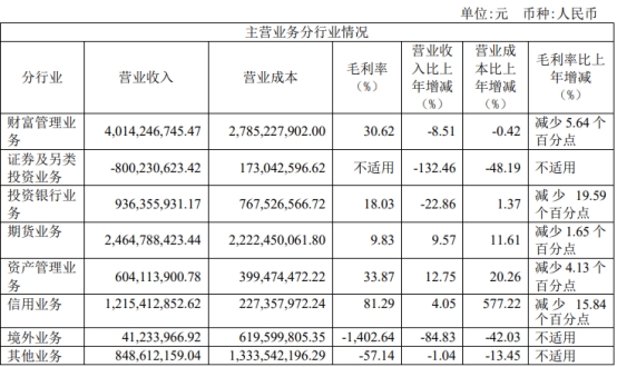 主营业务分行业来看,2022年,中泰证券财富管理业务收入为40.14亿元,同比下降8.51%;证券及另类投资业务收入为-8.00亿元,同比下降132.46%;投资银行业务收入为9.36亿元,同比下降22.86%;期货业务收入为24.65亿元,同比增长9.57%;资产管理业务收入为6.04亿元,同比增长12.75%;信用业务收入为12.15亿元,同比增长4.05%;境外业务收入为4123.40万元,同比下降84.83%;其他业务收入为8.49亿元,同比下降1.04%。